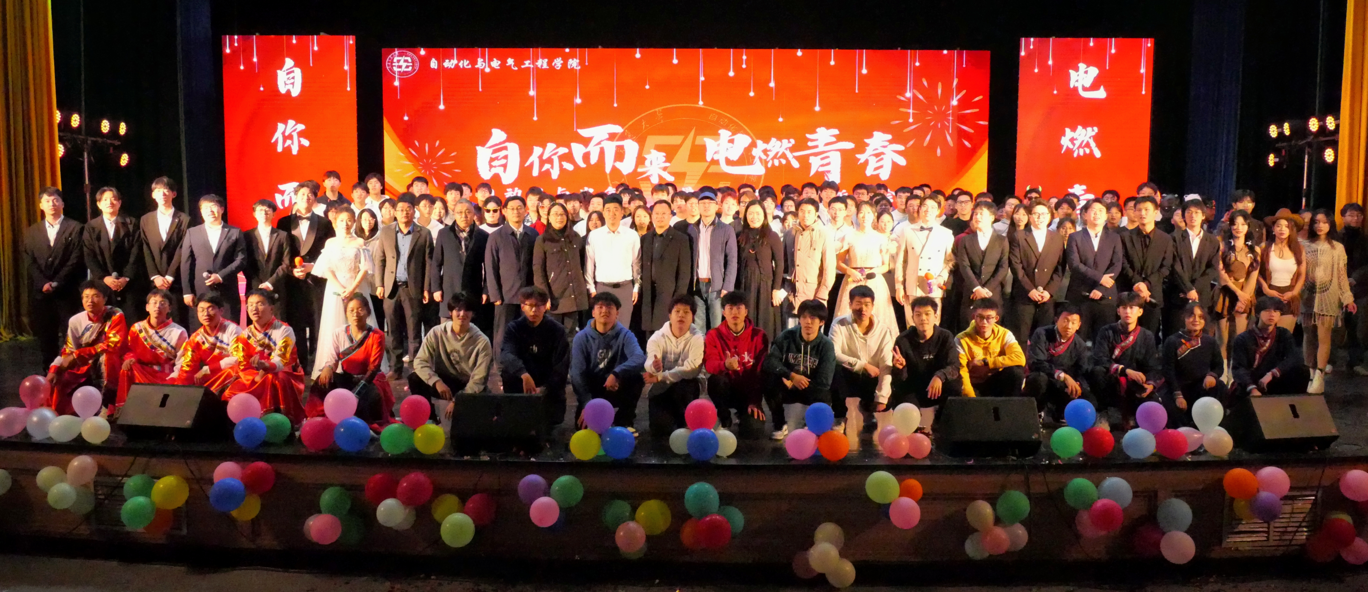校团委副书记李柏桥、学院党委书记叶凯、院长董华军、副院长冯庆胜、副院长郑祥、党委副书记闻竹、研究生辅导员孙贵雄、团委书记程飞、2021级辅导员蔺博到场与学生同乐共赏,学院2023级本科生、2023级研究生以及部分其他年级学生近千人到场观看。晚会由2023级本科生暴广远、程浩然、王诗怡、于洋等四名同学主持。